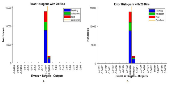 Error histogram for diagnosis of multi classes breast cancer dataset with magnification factor 40× using ANN with hybrid features of (a) VGG-19 and handcrafted feature (b) ResNet-18 and handcrafted feature.
