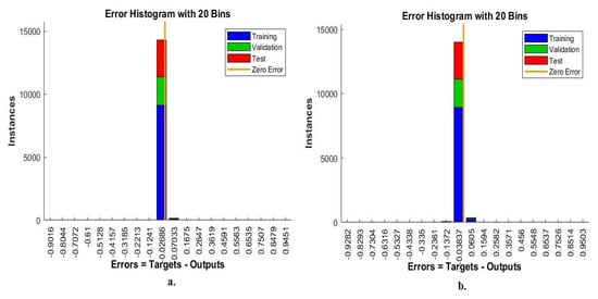 Error histogram for diagnosis of multi classes breast cancer dataset with magnification factor 400× using ANN with hybrid features of (a) VGG-19 and handcrafted feature (b) ResNet-18 and handcrafted feature.