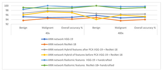 In contrast, with a magnification factor of 40×, ANN with the hybrid features of VGG-19 and ResNet-18 before reducing the dimensions reached an accuracy of 97%. While with a magnification factor of 400×, with the hybrid features of VGG-19 and ResNet-18 before reducing the dimensions, ANN reached an accuracy of 95.3%.