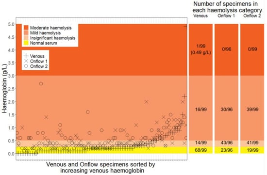 Measure of haemolysis (haemoglobin (g/L)) for each specimen collected by venepuncture and Onflow. Specimen results are sorted by increasing venous haemoglobin on the horizontal axis. The shaded areas represent the haemolysis classification [], which are also tabulated alongside the graph. g/L: grams per litre.