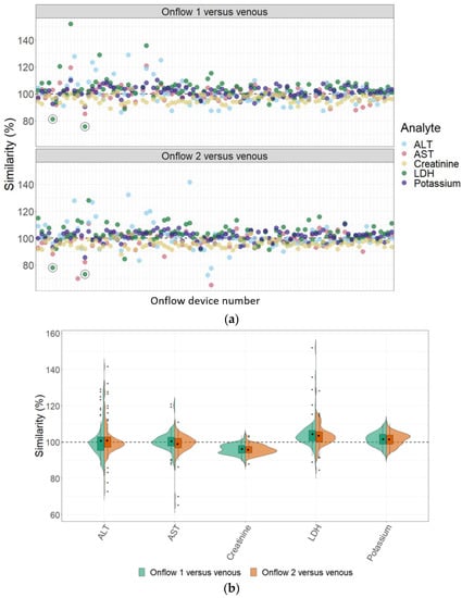 A total of 1467 (of 1470) laboratory test results were reported, with three ALT results from two specimens that could not be generated due to insufficient volume. The percentage similarity scatter plots (Figure 3a) further highlighted two results (#5 and #14) that reported lower LDH values by Onflow compared to venous that would have been considered clinically relevant, which was linked to increased haemolysis of the venous specimens (“mild” and “moderate” haemolysis, respectively). These results were therefore removed from further method comparison of all analytes, and the total number of specimens available for statistical analysis was 1452 (98.8%). The percentage similarity, visualised by split violin plots (Figure 3b), shows on average similar test results between the two Onflow devices for all analytes. The statistical analysis was thus performed on combined Onflow results compared to the venous results. Overall, the Onflow capillary blood results were lower for creatinine and higher for LDH and potassium when compared to the venous blood results. The percentage similarity scatter plots showed less scatter beyond specimen #35 for Onflow device 1 and specimen #49 for Onflow device 2, and there is evidence of more scatter among the ALT analyte overall, which may be due to the Onflow ALT specimens #1 to #49 being stored for seven days at 4 °C prior to testing.