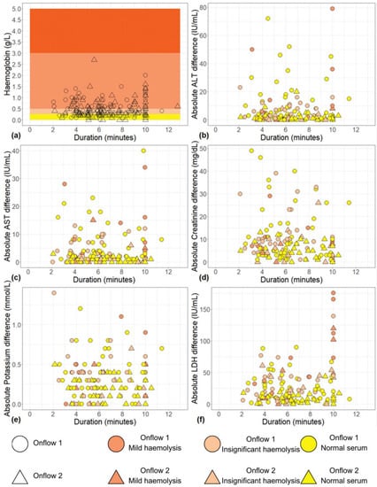 Once blood was collected by the Onflow devices, the tubes were removed from the devices and stored upright along with the venous blood SSTs at ambient temperature (~23 °C) for a maximum of 2 h before transport to the testing laboratory (clinical laboratory platform of the WITS Diagnostic Innovation Hub (WDIH, Johannesburg, South Africa). The transport from the collection site to the testing laboratory is approximately a 5-min drive. At the laboratory, the Onflow blood tubes were weighed using an OHAUS® Navigator™ scale (OHAUS Corporation, Parsippany, NJ, USA), and three decimal points were recorded. The approximate blood volume was obtained by subtracting the mean tube weight (empty) from the total weight and dividing it by the density of blood (1.06 g/mL []). The specimens were centrifuged at 5000× g for 2 min to separate the serum from the blood cells. The haemoglobin concentration (g/dL) was measured using 10 µL of serum tested on the HemoCue® Plasma/Low Hb System (HemoCue AB, Ӓngelholm, Sweden). The absolute result was converted to g/L, which was used as a measure of haemolysis according to conventional haemolysis classifications []. Briefly, haemolysis was defined as not haemolysed (free haemoglobin ≤0.25 g/L) or as having insignificant (free haemoglobin >0.25 g/L and ≤0.5 g/L), mild (free haemoglobin >0.5 g/L and ≤3.0 g/L), moderate (free haemoglobin >3.0 g/L and ≤5.0 g/L) or gross (free haemoglobin >5.0 g/L) haemolysis []. The remaining serum in the Onflow tube was transferred into clear Polystyrene, round-bottom test tubes (JPlast Plastic Products, Roodepoort, Gauteng, South Africa) and five analytes were tested on the cobas c 501 chemistry analyser (Roche Molecular Systems, Pleasanton, CA, USA): aspartate transaminase (AST), alanine transaminase (ALT), potassium, creatinine and lactate dehydrogenase (LDH). Residual specimens were stored at 4 °C. The ALT analyte was measured from refrigerated venous and Onflow specimens (within seven days of being stored) for the first 49 specimens.