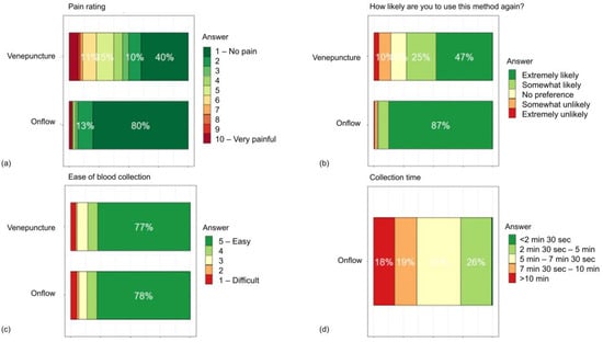 Usability and acceptability of the Onflow device compared to venepuncture (a) Participant pain rating for venepuncture and onflow, (b) Participant likelihood of using venepuncture and Onflow again, (c) Participant-perceived ease-of-use, and (d) Time taken for Onflow specimen collection.