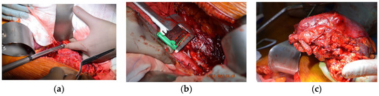Perioperative images of the second case. (a) The resection of the IVC with a TEA stapler. (b) Left renal vein resection with a TEA stapler. (c) Final postoperative aspect.