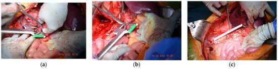 Subsequently, after surgical evaluation, it was decided that a right nephrectomy with an inferior vena cava resection without ulterior reconstruction was needed. Intraoperatively, thrombosis was identified, which determined inflammatory phenomena that did not allow for recanalization of the intrahepatic-reno-periumbilical vena cava. The IVC was obliquely sectioned, and the preservation of the left renal vein at its implantation site was carried out. Sectioning was performed at approximately 2 cm above the IVC’s bifurcation with the help of a 45 mm TEA stapler, along with the application of a clip on the right renal artery (Figure 2).