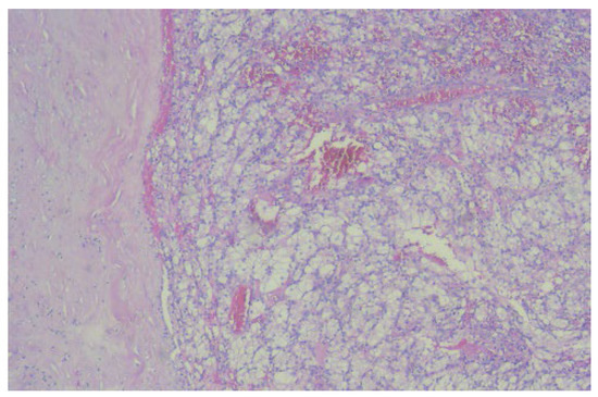 The microscopic image (×40) from the histopathological examination shows the presence of a tumorous thrombus in the lumen of the venous wall, which indicates the presence of clear cell renal carcinoma.