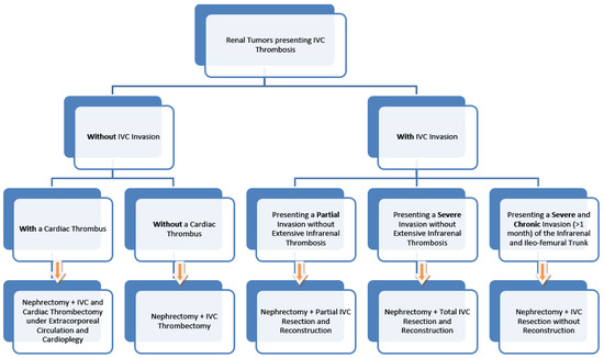 The surgical algorithm was proposed by the multidisciplinary team of the St. Constantin Hospital Brasov, presenting various surgical options in the case of renal tumors that simultaneously present IVC thrombosis, and the algorithm can be used if there is no proof of metastatic disease. The algorithm was developed after the two successful IVC resections, which did not require an ulterior reconstruction (Figure 7).