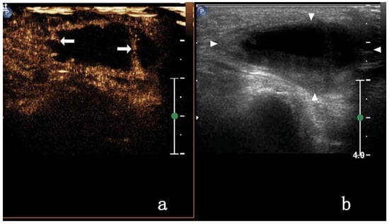 In this study, the primary lesions of metastatic inguinal lymph nodes were found in the skin, gastrointestinal tract, reproductive organs, and urinary system. Metastatic lymph nodes mostly retain the biological characteristics of the primary lesion [36,37]. Pathologically poorly differentiated and rapidly growing tumors will metastasize to lymph nodes and easily lead to internal lymph node necrosis. In this study, five patients with metastatic inguinal lymph nodes showed annular enhancement by CEUS, and no enhancement area was observed inside. The ultrasonic imaging in the VD TB group showed a similar ring enhancement that was slightly thicker than the thickness of VD TB. These findings may be associated with the inflammatory lesions in VD TB in which the VD wall thickens and pus forms in the lumen simultaneously, which leads to tube cavity expansion as the pus accumulates, and as the pressure increases, the wall becomes thinner. This possible mechanism should be confirmed via further studies with a larger cohort of patients with VD TB. Among the 17 patients with VD TB in our study, 4 showed septal enhancement by CEUS (Figure 3), whereas those with metastatic lymph nodes did not. We believe that this was a characteristic ultrasonic manifestation of VD TB, and a greater septal enhancement by CEUS could enable physicians to exclude metastatic lymph nodes. Due to the limited sample size in this study, the view that separated sample enhancement is the characteristic CEUS manifestation of VD TB needs to be further confirmed by increasing the sample size.
