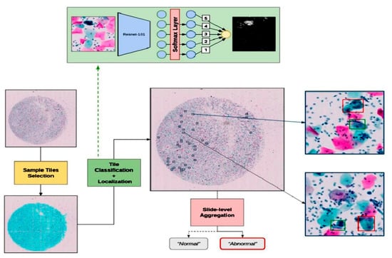 The research aims to improve accuracy with a reliable system. Therefore, Lei Cao et al. [94] suggested a more accurate system for detecting cervical cancer. Their method is based on a feature pyramid network to automatically classify cytological images by detecting abnormal cells. Their distinguished model has two features: the first is the reading way of the cervical cytology images, which is the same as pathologists, and the second is detecting abnormal cells at different scales using a multi-scale region-based fusion network. Their designed approach builds on clinical knowledge about abnormal cervical cells based on their shapes and sizes. The performance of their approach is better than the DL approach. Their highest accuracy was 95.8% on the independent dataset. Their process is accurate and quick, and their diagnosis time is 0.04 s per image, which is faster than pathologists’ diagnoses. For dealing with big-size images such as 1000 × 1000 pixels, Antoine Pirovano et al. [95] proposed the classification under regression constraints. Their experiment enhanced the sensitivity by up to 80% for localizing malignancy in whole slide images. The proposed approach can be integrated with the pathology laboratory system to improve prediction. Figure 4 illustrates their approach.