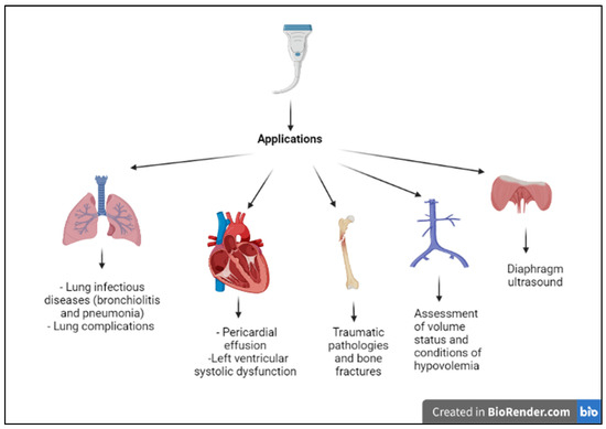 The main field of application of thoracic ultrasound is the study of the lungs; however, recently, the use of thoracic ultrasound has shown promising results in the study of other districts as well, summarized in Figure 1.