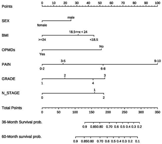 A total of nine risk factors were identified with statistically significant contributors (p < 0.05). Gender, BMI, smoking history, drinking history, OPMDs, pain scores, SCC grade, T stage, and N stage were further included in a univariate Cox regression analysis model for further analysis, and detailed data are shown in Table 3. In gender groups, the Hazard Ratio (HR) of male patients was set to 1, and that of female patients was 0.487, p < 0.05, indicating a statistically significant difference. In the BMI group, the risk was set as I in the group less than 18.5, and the HR value was 0.767 in the 18.5–24 group and 0.481 in the group greater than 24. The difference was statistically significant in the group greater than 24 (p < 0.05). In the smoking group, the risk of the non-smoking group was set as 1, and the HR value of the smoking group was 1.632; the difference was statistically significant (p < 0.05). In the drinking group, the risk of the non-drinking group was set as 1, and the HR value of the drinking group was 1.735, and the difference was statistically significant (p < 0.05). In the group of OPMDs, the risk of the group without OPMDs was set as 1, and the HR value of the group with OPMDs was 0.279, with a statistically significant difference (p < 0.05). In the grouping of pain degree, the risk of the 0–2 group was set as 1, the HR of the 3–5 group was 1.786, the 6–8 group was 3.223, and the 9–10 group was 6.847; the difference was statistically significant (p < 0.05). In SCC grade, the risk of grade 1 was set as the HR value of grades 1 and 2 was 2.009, that of grade 3 was 4.635, and that of grade 4 was 4.558, and the difference was statistically significant (p < 0.05). In the T stage, the risk of T1 was set as the HR value of 1, the HR value of T2 was 2.047, T3 was 3.286, and T4 was 3.654; the difference was statistically significant (p < 0.05). In the N stage, the risk of N0 was set as 1, and the HR value of N1 was 2.711, N2b was 3.040, N2c was 8.624, and N3 was 47.613, with statistically significant differences (p < 0.05). Detailed data are shown in Table 3.