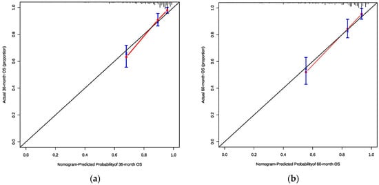 (a) The consistency calibration curves of the nomogram for oral squamous cell carcinoma (3-year); (b) The consistency calibration curves of the nomogram for oral squamous cell carcinoma (5-year).
