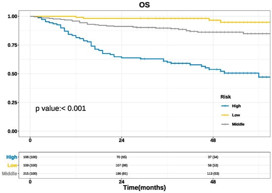Using our established nomogram, the total predicted scores of 432 patients in the study were arranged from small to large, and the study patients were grouped by quartile. The first quartile Q1 and the third quartile Q3 were used as cut-off values, and the study patients were divided into low-risk, medium-risk, and high-risk groups. Kaplan-Meier survival analysis and a log-rank test were performed for survival data. The results are shown in Figure 3 (p < 0.001), indicating a statistically significant difference indicating good clinical practicability of the nomogram.