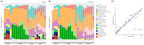 Relative abundances of bacterial species depending on primers: (A) V1-V2, (B) V1-V2/ITS2 primers, and (C) the correlation between abundances determined using V1-V2 and V1-V2/ITS2 primers.
