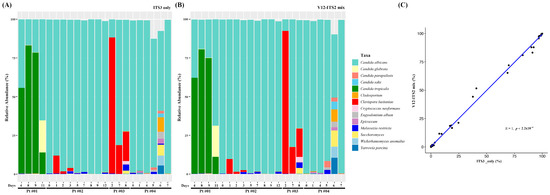 Relative abundances of fungal species depending on primers: (A) ITS2, (B) V1-V2/ITS2 primers, and (C) the correlation between abundances determined using ITS2 and V1-V2/ITS2 primers.