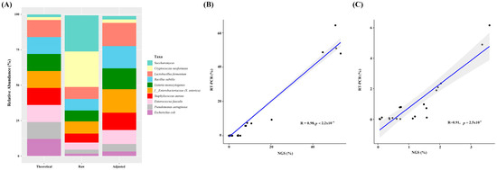 Adjustment of relative abundance. Read counts of taxa assigned to the fungi kingdom were reduced by a factor of 20 for adjustment. (A) Relative abundances in the microbial community DNA standard. Fungal relative abundances were adjusted to match abundances in the microbial community DNA standard. (B) Correlation between relative bacterial abundances determined by RT-PCR and V1-V2/ITS2 targeting NGS after adjusting fungal abundance. (C) Correlation between Candida albicans relative abundance determined by RT-PCR and V1-V2/ITS2 targeting NGS after adjusting fungal abundance. RT-PCR, real-time PCR; NGS, next-generation sequencing.