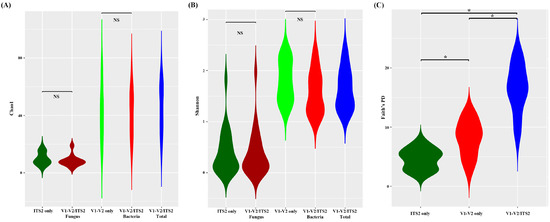 Chao1, Faith PD, and Shannon indices were used to evaluate alpha diversities depending on the primers. Similar Chao1 and Shannon index was observed between V1-V2 and bacterial reads from mixed V1-V2/ITS2 primers and between ITS2 and fungal reads from mixed V1-V2/ITS2 primers (Figure 4A,B). However, V1-V2/ITS2 primers exhibited significantly higher richness than ITS2 or V1-V2 primers based on Faith PD results, which incorporate phylogenetic differences (Figure 4C).