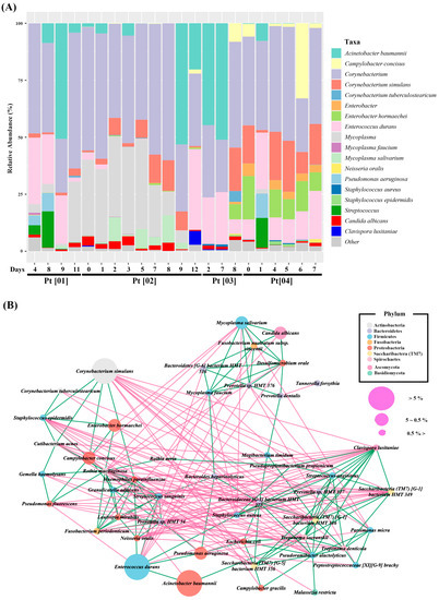 In many studies, the correlations between the abundances of fungal and bacterial species have been analyzed following individual by community analysis [38,39,40]. Furthermore, since information about the relative abundances of bacteria and fungi is limited, it is difficult to merge reported relative abundances directly in a single plot. When we simultaneously plotted bacterial and fungal relative abundances obtained using V1-V2/ITS2 primers for individual samples, the relative abundances of C. albicans and Clavispora lusitaniae were determinable within bacterial populations (Figure 5A). One of the advantages of using V1-V2/ITS2 primers is that results enable shifts in fungal relative abundances to be better understood than those obtained using individual primers. For example, in a patient [01], an increase in C. tropicalis abundance was observed on days 8 and 9 samples (Figure 2). However, when V1-V2/ITS2 primers were used, the overall relative abundance of fungus was found to decrease on days 8 and 9, indicating the increases in C. tropicalis abundance observed on these days were the result of C. tropicalis surviving during a decrease in total fungal abundance rather an increase in C. tropicalis abundance (Figure 5). Thus, the simultaneous determination of bacterial and fungal community abundances provides more comprehensive information regarding microbiome changes compared to single analysis.