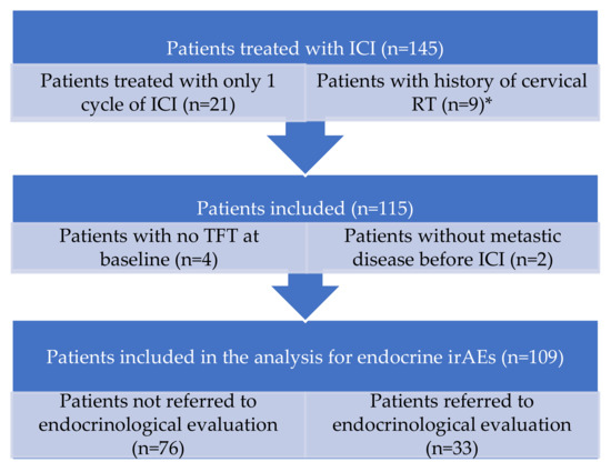 In our retrospective study, we decided to perform several exclusion criteria for the NSCLC cohort to be appraised for endocrine dysfunctions. The rationale behind these constrictive exclusion criteria was to better identify patients to evaluate for endocrine toxicities and avoid bias. Thyroid dysfunction assessment consists of baseline and dynamic TFT, so patients without baseline TFT were excluded. Cervical radiotherapy for head and neck cancers is well known as a bias in thyroid function abnormalities [
