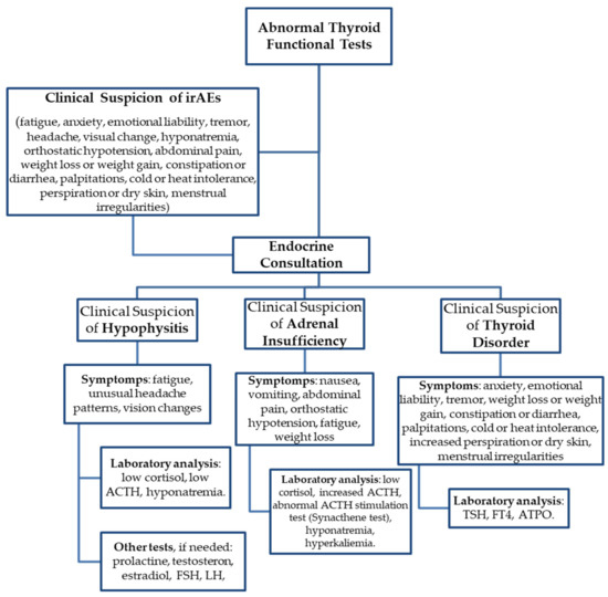 58]. In conjunction with the fact that most irAEs can be successfully managed, it became crucially important to identify the patients at risk of adverse events in a timely manner. Predictive and sensitive biomarkers might be useful to adequately stratify the risks in these patients and to monitor them closely for early detection and treatment. Several cytokines, and chemokines such as IL-2, IL-8, granulocyte colony-stimulating factor (G-CSF), IFN-γ, TNF-α, granulocyte–macrophage colony-stimulating factor (GM-CSF), monocyte chemoattractant protein (MCP-1), antithyroglobulin autoantibody (TgAb) and anti-TPO autoantibody (TPOAb), have been identified to be significantly interrelated with thyroid irAEs [