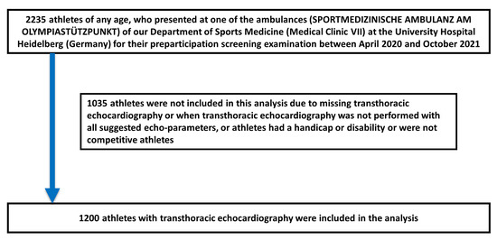Athletes were eligible for inclusion in this study if they performed regular training for competition and presented for preparticipation screening examination or post-COVID-19 return-to-sport testing [12,16,19,20,21]. Athletes without transthoracic echocardiography, or for whom echocardiography was performed, but not all suggested echo-parameters in the echocardiography were available, or athletes who had a handicap or disability or were not competitive athletes were not included in the study (see flowchart in Figure 2).