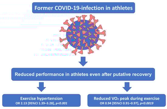 The impact of former COVID-19 infection on the performance of athletes is not fully understood. We aimed to identify differences in athletes with and without former COVID-19 infections. Competitive athletes who presented for preparticipation screening between April 2020 and October 2021 were included in this study, stratified for former COVID-19 infection, and compared. Overall, 1200 athletes (mean age 21.9 ± 11.6 years; 34.3% females) were included in this study from April 2020 to October 2021. Among these, 158 (13.1%) athletes previously had COVID-19 infection. Athletes with COVID-19 infection were older (23.4 ± 7.1 vs. 21.7 ± 12.1 years, p < 0.001) and more often of male sex (87.7% vs. 64.0%, p < 0.001). While systolic/diastolic blood pressure at rest was comparable between both groups, maximum systolic (190.0 [170.0/210.0] vs. 180.0 [160.0/205.0] mmHg, p = 0.007) and diastolic blood pressure (70.0 [65.0/75.0] vs. 70.0 [60.0/75.0] mmHg, p = 0.012) during the exercise test and frequency of exercise hypertension (54.2% vs. 37.8%, p < 0.001) were higher in athletes with COVID-19 infection. While former COVID-19 infection was not independently associated with higher blood pressure at rest and maximum blood pressure during exercise, former COVID-19 infection was related to exercise hypertension (OR 2.13 [95%CI 1.39–3.28], p < 0.001). VO2 peak was lower in athletes with compared to those without COVID-19 infection (43.4 [38.3/48.0] vs. 45.3 [39.1/50.6] mL/min/kg, p = 0.010). SARS-CoV-2 infection affected VO2 peak negatively (OR 0.94 [95%CI 0.91–0.97], p < 0.0019). In conclusion, former COVID-19 infection in athletes was accompanied by a higher frequency of exercise hypertension and reduced VO2 peak.