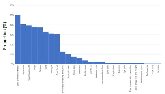 Overall, 10.2% of the SARS-CoV-2 infections were asymptomatic. The most prevalent symptoms were loss of smell and/or taste, headache, fever, and cough (Figure 4). Dyspnea/breathing difficulties occurred in 12.7% and chest pain in 7.6% of the infections.