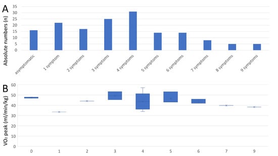 Total numbers of symptoms during COVID-19 infection and peak VO2 value. Panel A—Total number of athletes stratified by total number of symptoms during COVID-19 infection. Panel B—Peak VO2 value of athletes stratified by total number of symptoms during COVID-19 infection.