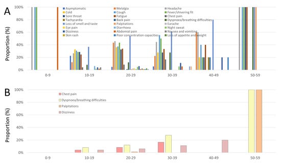 Symptoms during COVID-19 infection stratified by age decades. Panel A—Symptoms during COVID-19 infection stratified by age decades. Panel B—Chest pain, dyspnea, palpitations, and dizziness during COVID-19 infection stratified by age decades.