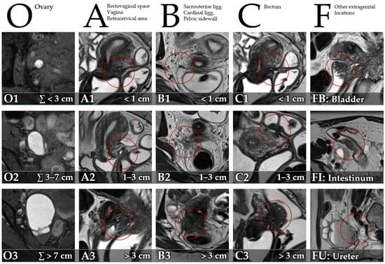 MRI images were reviewed on a Picture Archiving and Communication System (PACS) workstation. A radiologist with 7 years’ experience in pelvic MRI reviewed the images, blinded to results of surgery and histopathology. Clinical information was available to the reader of the index test. Presence and size of DIE were recorded utilizing the Enzian classification [] (Figure 2) for compartments/organs A (rectovaginal space, vagina, retrocervical area), B (sacrouterine ligg., cardinal ligaments, pelvic sidewall), C (rectum), O (ovary), FB (bladder), FU (ureter), FI (intestinum), and FO (other). Size of lesions was graded for compartments A, B, and C (1: <1 cm, 2: 1–3 cm, 3: >3 cm). The summed size of endometriomas was graded for category O (1: ∑ < 3 cm, 2: ∑ 3–7 cm, 3: ∑ > 7 cm).