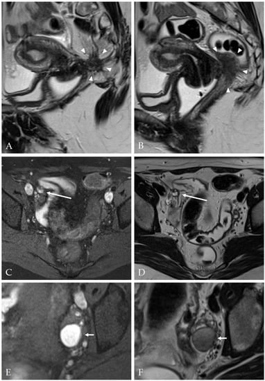 MRI scans were performed using two 1.5-T magnet scanners (n = 92 and n = 66) and a 3-T scanner (n = 2). The MRI acquisition protocol included the sequences recommended in current guidelines and reviews [,,]: T2-weighted FSE (fast spin echo) sequences in axial, sagittal, and coronal orientation; axial T1-weighted FSE sequences without and with fat suppression. In accordance with guidelines, the MRI examinations were scheduled without regard to the menstrual cycle []. Patient preparation included rectal opacification with water (n = 156) and vaginal opacification with ultrasound gel (n = 133). These measures are considered ‘optional’ or ‘conditionally recommended’ in current guidelines and are performed by many teams [,]. No further bowel preparation was carried out prior to the examination, which is in accordance with the guidelines of the Society of Abdominal Radiology [] and is consistent with the practice of many teams []. To achieve moderate filling of the urinary bladder, as recommended [,], patients were asked to empty their bladder 1 h prior to the examination. As recommended in recent guidelines [], an anti-peristaltic agent (IV hyoscine butylbromide 20 mg) and IV contrast agents were administered in most cases (gadoteridol 0.1 mmol/kg) (n = 158), including acquisition of axial and sagittal T1-weighted FSE sequences with fat suppression and T1-weighted gradient–echo urography.