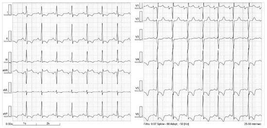 Initial laboratory data showed a total white blood count with significant eosinophilia (i.e., 42.7% of the white blood cells), mild anemia (hemoglobin of 11.9 g/dL, hematocrit 36%), mild thrombocytopenia (128.000/mm3), and normal electrolyte levels as well as renal and liver function. Acute inflammatory reactants (erythrocyte sedimentation rate and fibrinogen) were within normal limits. The baseline N-terminal pro-B-type natriuretic peptide (NT-proBNP) value was 6541 pg/mL (cut-off value <125 pg/mL), and a lactate dehydrogenase value of 1000 U/L was also detected. The electrocardiogram illustrated sinus tachycardia with 93 bpm and a normal QRS axis; however, an incomplete right bundle branch block, as well as negative T waves in lateral and inferior leads, were also detected (see Figure 1).