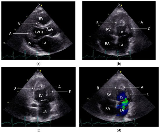 Bidimensional TTE images. (a) The parasternal long axis revealing the presence and extension of the intraventricular mass towards the posterior wall and subvalvular apparatus. (b) Apical four-chamber view (A4C) depicting the hyperechogenic structure obliterating the apex and lateral wall. (c) Apical two-chamber view (A2C) showing the extent of the intraventricular mass to the anterior wall of LV. (d) A4C and color doppler showing moderate-to-severe mitral regurgitation. A—intraventricular mass, AoV—aortic valve, B—interventricular septum, C—lateral wall of the left ventricle, D—inferior wall of the left ventricle, E—anterior wall of the left ventricle, LA—left atrium, LV—left ventricle, LVOT—left ventricular outflow tract, RA—right atrium, and RV—right ventricle.