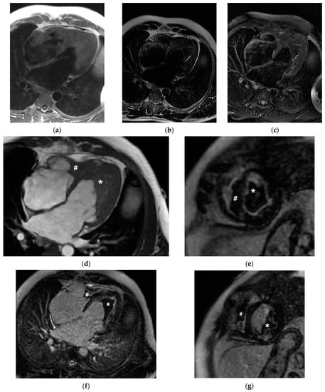 CMR images revealing left (*) and right (#) intraventricular masses. (a) T1-weighted 4C view. (b) T2-weighted 4C view. (c) T2-weighted fat-suppressed 4C view. (d) 4C-balanced free steady-state precession 4C view. (e,g) Late gadolinium-enhanced SA view. (f) Late gadolinium-enhanced 4C view.