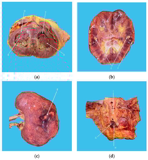 (a) Organized intraventricular thrombi (A and B) are seen in the left (C) and right ventricle (D), respectively. (b,c) Medullar (E) and cortical (F) infarcted areas of the left kidney. (d) Infrarenal aorta (I) with a large saddle thrombus (G) on the aortic bifurcation (H). IVS—interventricular septum and RP—renal pelvis.