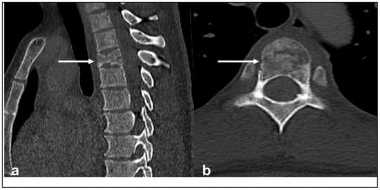 Sagittal (a) and axial (b) CTs demonstrating primary osteosarcoma in the upper thoracic spine (white arrows). Note the osteoid matrix, characterised by an area of sclerosis, as well as lytic areas. A pathological fracture is also present.