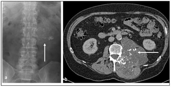 AP radiograph of the lumbar spine (a) and axial CT of the abdomen (b) demonstrating a chondrosarcoma arising from the left lateral aspect of the L2 vertebra, involving the body, left transverse process and pedicle (white arrows). Large soft tissue component with internal “rings and arcs” type calcification, in keeping with a chondroid matrix, is a characteristic feature.