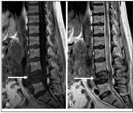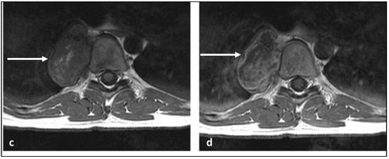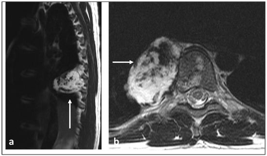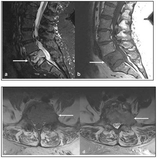 The defining feature of bone lymphoma is permeative infiltration of the bone marrow without cortical destruction. In the majority of cases, an adjacent soft tissue mass is present [32,34]. The soft tissue mass is sometimes visible on plain film, but CT and particularly MRI enable accurate delineation of the soft tissue mass. Most commonly, the T1 and T2 signal is reduced (Figure 8a,b), but nodular sclerosing lymphoma can be T2 hyperintense [35]. Typically, both the vertebral body and arch are involved and there can be vertebral collapse. Extra-osseous extension into the paravertebral soft tissues and epidural space is also common [1].