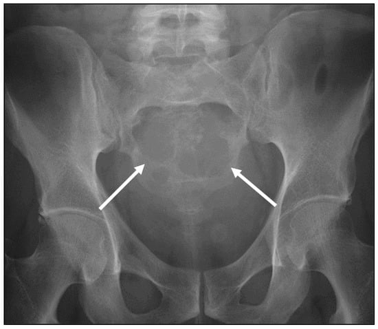 AP pelvic radiograph of a patient with sacral chordoma demonstrating the osseous destruction of the sacrum (white arrows).