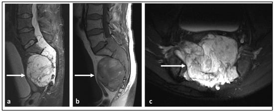Sagittal STIR (a), sagittal T1 (b) and axial STIR (c) sequences highlighting a large sacral chordoma (white arrows). Note the locally destructive nature of the lesion with large extra-osseous soft tissue component. The lesion shows predominant high fluid signal in keeping with myxoid content and foci of high T1 signal indicative of haemorrhage and/or mucinous content.