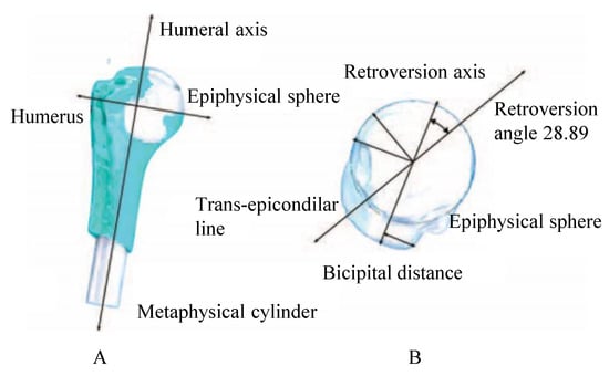 The retroversion axis was found perpendicular to the center of the junction line of the ends of the cartilage, in a cutting plane that coincides with half of the sphere from the transversal view. Then, the bicipital distance (BD) was evaluated as the perpendicular distance between the retroversion axis and the end of the tuberosity of the humeral head. Equation (1) shows the retroversion angle [].