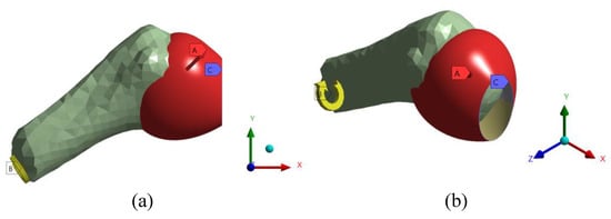 (a) Front view, and (b) isometric view for the boundary conditions applied to the 3D model: uniformly distributed pressure caused by the synovial capsule (A), external rotation applied on the humerus in the axial direction (B), and labrum fixed boundary (C).