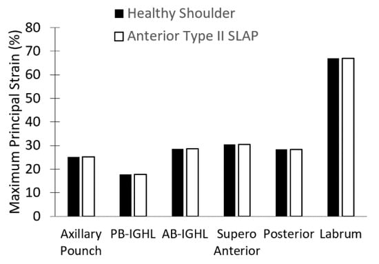 Maximum principal strain for the healthy glenohumeral joint and an injured joint (Isolated Type II SLAP lesion) at 30° with an anterior Isolated Type II SLAP.