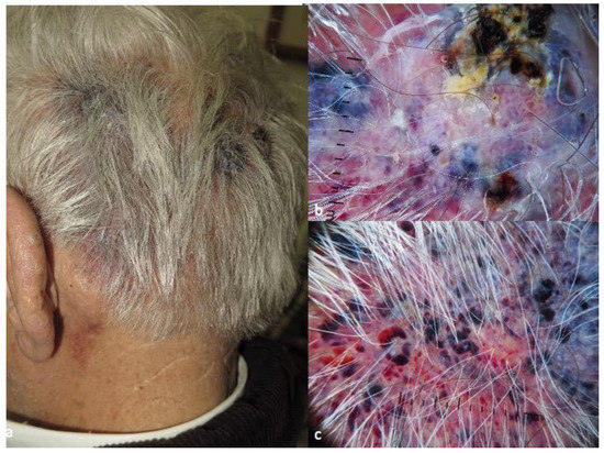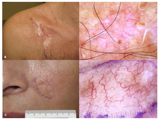 - Zalaudek, I.; Gomez-Moyano, E.; Landi, C.; Navarro, M.L.; Ballesteros, M.D.F.; De Pace, B.; Vera-Casaño, A.; Piana, S. Clinical, dermoscopic and histopathological features of spontaneous scalp or face and radiotherapy-induced angiosarcoma. Australas. J. Dermatol. 2013, 54, 201–207. [Google Scholar] [CrossRef] [PubMed]