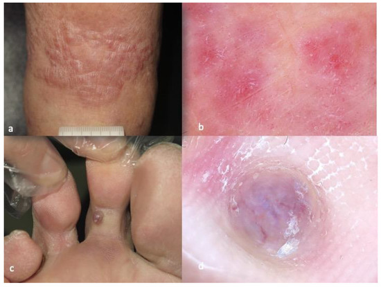 Clinical aspect of patch-type Kaposi’s sarcoma (a), displaying purple-pink color in the background, white lines, white clods and rosettes in dermatoscopy (b). Clinical aspect of nodular Kaposi’s sarcoma lesion (c), characterized by the presence of collaret and polychromatic (“rainbow”) pattern in dermatoscopy (d). The photos are from the databases of two of the authors (Z.A., A.L.) and all individuals have provided written informed consent for the use of their photos for scientific purposes.
