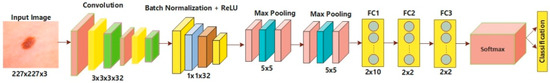 There exists numerous layers in CNNs such as convolutional, pooling, batch normalization, FC, activation, and a classification layer. CNNs outperform in the problems that are related to the image data. Our proposed SCDet consists of 32 layers, including the image input layer as the first layer of the model, 31 hidden layers in between, along with the output layer. The proposed model’s architecture is shown in Figure 1. The dermoscopic images of skin lesions from the dermis dataset are initially provided to the image input layer of the proposed model. Convolutional layers are added to the proposed CNN for the extraction of more prominent features from the images. A batch normalization layer and ReLU layers are inserted after the pair of convolutional layers to normalize the data and prevent overfitting. After that, a pair of max pooling layers are added to summarize the features to reduce the computational cost. Finally, three fully connected layers are used to convert the data into a one-dimensional array for the detection of skin lesions. At the end, softmax and classification layers are added for the final prediction of malignant and benign tumours of skin lesions.