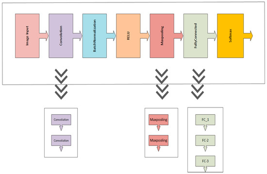 Max-pooling, convolution, and fully connected layers are further expanded to improve the accuracy, as shown in Figure 2. We used a pair of convolution layers after the image input layer so that our proposed model extracted the most prominent features from the images because these features are used to boost the model’s performance. Similarly, as shown in Figure 2, we used the pair of max pooling layers to reduce the computation levels and generate a smaller feature map. Finally, three fully connected layers are used for the conversion of the feature map into a one-dimensional vector.