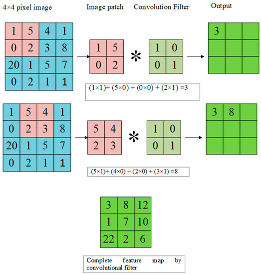 The convolutional layer creates feature maps that highlight the hidden features of an original image. Convolutional layers use some fixed-size filters known as convolutional filters that can be 5 × 5, 3 × 3, or even 1 × 1. Convolutional filters perform a function on input images by sliding a trained filter over the image. Weight and bias values remain the same throughout the image during the sliding of the trained filter [38]. Convolutional filters are determined during the training process and not selected manually. The convolutional filter of 2 × 2 is applied to an image of 4 × 4 pixels in Figure 3 given below. An image patch of 2 × 2 is obtained from the image, then the image patch is multiplied with the convolutional filter, and the result is obtained in the form of a matrix. The convolutional filter strides on the image with an image stride of 1 and the final matrix is the complete feature map obtained from the convolutional filter.