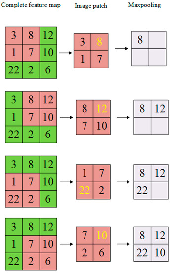 Feature maps generated through convolutional filter and activation function are further summarized by the max pooling process. Smaller feature maps are generated by max pooling as it reduces the size, therefore mitigating the computational load and reducing the chance of overfitting. Complexity for the next layers is reduced with downsampling, which is achieved using a pooling layer. The most important type of pooling is max pooling which returns only a rectangular sub-region of an image with a maximum value of the sub-region. The largest or maximum value of each patch of every feature map is calculated with the max pooling operation. The results are down-sampled and highlight the most present features in the patch, the process of max pooling is shown in Figure 4.
