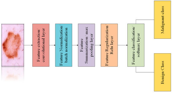 Process of skin lesion detection into benign and malignant classes is presented in Figure 5. Initially, images are provided to the image input layer, then features are extracted using convolutional layer. After that, extracted features are normalized and provided as input to the ReLU layer. ReLU layer regularizes the features, which helps the model to minimize the problem of overfitting. After that, features are summarized using max pooling and finally classified as benign and malignant tumours by classification layer.